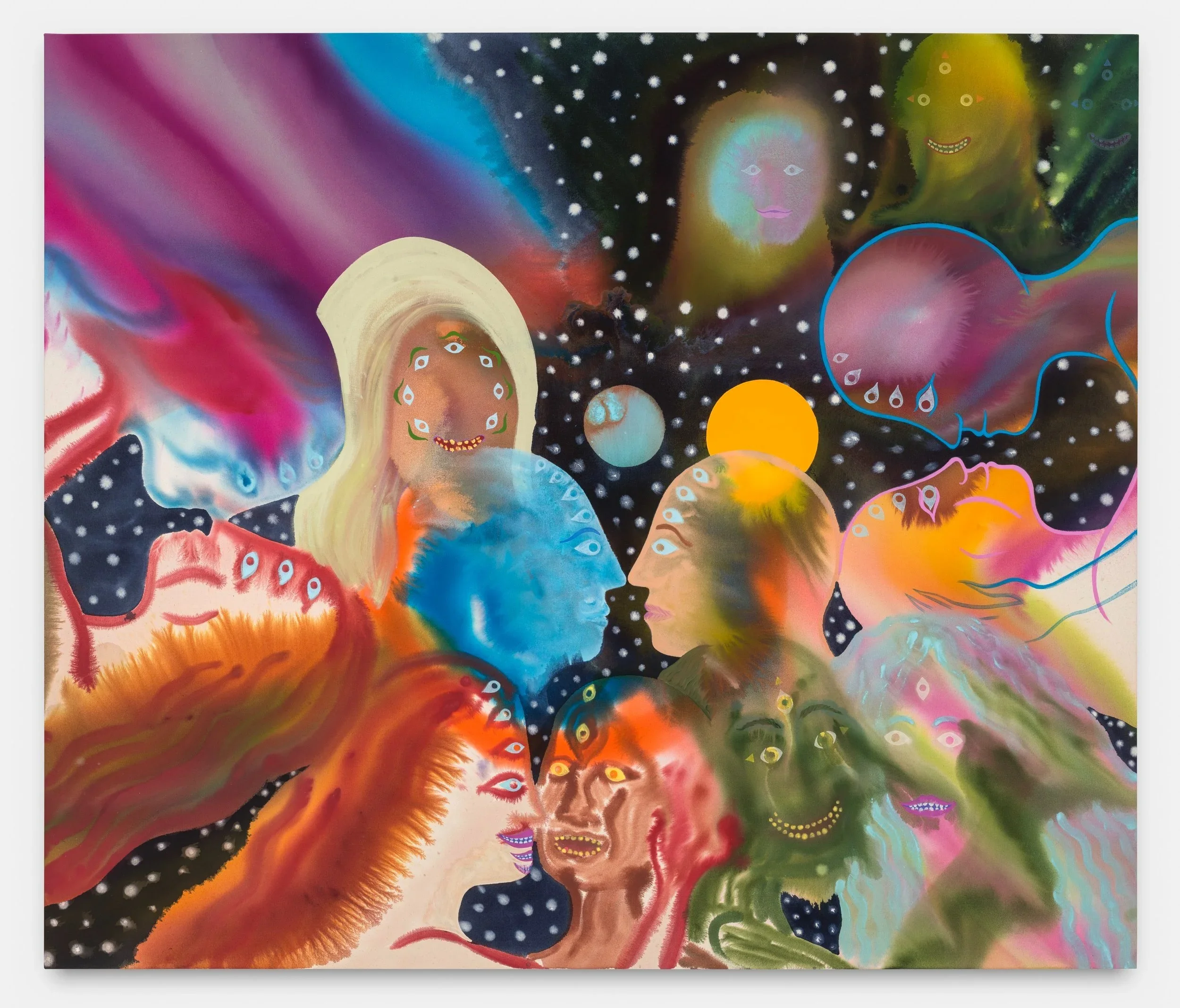 Aaron Johnson’s paintings vibrate with ethereal figures that dissolve into hazes of disembodied color, juicy luminosity, and radiant blurs. His fluid approach to painting is rooted in the tradition of Color Field painting, working on the floor staining raw canvas with washes of color, allowing spontaneity and unpredictability to drive the compositions. Allowing the paint to flow freely, the process connects with ideas of cosmic and natural forces, and the interconnectedness of all things. His spiritlike figures are in turns comical, angelic, grotesque, and ghostly. Romantic moments reveal embracing, starry-eyed lovers who melt into each other, combine energies, and meld into a psychedelic nonduality. The dreamy landscapes seem to suggest life on another planet, or in another dimension, abundant with strange magic.